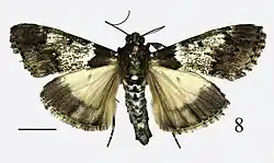 The wingspan is 32–36 mm. The basal area of the forewings is dark brown, mixed with black scales. The median area is white, with scattered brown scales and the distal area is ochreous brown, mixed with black and white scales. The costa is brown from the basal one-third to two-thirds, mixed with black scales, diffused to above the cell, with a white spot near the base and raised black scales at its outside, with a second white spot at the outside of the postmedian line, spreading to below R5. The antemedian line is black, extending from the costal one-fourth obliquely inward to the scale tuft near the base, then obliquely outward to below 1A+2A, finally obliquely inward to the dorsal one-third. The postmedian line is black, extending from the costal two-thirds obliquely outward to M2, then curved and extending inward along CuA1, forming an angle, finally straight to the dorsal two-thirds, its inner margin serrated. The discal and discocellular spots are black, the latter relatively large and the terminal line is pale yellow, with subrectangular brown or blackish-brown spots uniformly placed along its inner side, interrupted by white mixed with brown at the veins. The basal two-thirds of the hindwings is yellowish white, the distal one-third greyish brown, becoming paler from the costa to the dorsum and the discocellular spot is pale greyish brown.