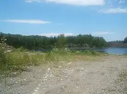 Because of the high mineralization, several mines have opened in the belt. Sherman Mine, northwest of the town of Temagami, was a major producer of iron ore. Mining operations began in 1968,[5][36] and workings consisted of seven open pits: North Pit, East Pit, South Pit, West Pit and three relatively small open pits known as the Turtle Pits. A railroad was built from the Ontario Northland Railway to Sherman Mine in the 1960s to make transportation and shipping of iron ore easier and faster across Ontario.[37] To the north, Temagami North was constructed as a resource town in the 1960s to supply Sherman Mine.[36] With an average overall grade of 25% iron, the mine produced approximately 10,700 tons of crude ore per day and its mill capacity was 1,000,000 long tons (1.0×109 kg) of iron ore pellets per year.[5] Operations at Sherman Mine ceased in 1990 after its owner Dofasco announced that they would be closing the mine. The municipality of Temagami made several approaches to Dofasco before the closer of Sherman Mine, offering a partnership in the community's future in terms of shared funding for a Sherman Park. However, it was informed during discussions with Dofasco's media executives that in the future they could not be counted on for maintenance funds for parks or anything else that was being done in partnership with the community. This caused a large attitudinal change from a few months earlier when the mine was associated with much of Temagami.[36][38] The closure also had a significant impact on the economy of Temagami.[36] There is still iron ore at Sherman Mine, but Dofasco were able to obtain it more cheaply elsewhere.[39]