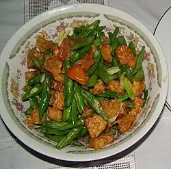 Stir-fried tempeh with vegetables such as green bean, basil, or onion, with spices.[56] Other recipes might add coconut milk for a milky-colored, and rather moist, stir-fried tempeh.