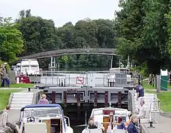 The pound lock was built in 1773, the sixth downstream of the eight constructed after the passing of the 1770 navigation act. Like the others it had to be rebuilt in 1782 and though estimates were obtained for stone and timber, timber was chosen because it was cheaper.