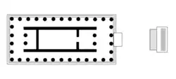The dimensions of the foundations and the architectural fragments indicate that the temple was a Doric hexastyle peripteral temple, i.e. it had a colonnade extending around the whole exterior, with six columns at the front and rear ends and thirteen columns along the north and south sides. The pronaos at the eastern end of the temple contained two columns between the antae and a door to the cella and was unusually deep (4.65 metres).[44] It was matched by a shallower, closed opisthodomos at the western end.[45][46] The whole structure stood atop a three-step crepidoma, which was 1.068 metres high.[45][46] At the bottom step of the crepidoma, the superstructure was 34.961 metres long by 16.125 metres wide; the building itself was 32.847 long by 14.052 metres wide.[46] The height of the temple from the bottom step to the cornice was about 9.7 metres.[46] The design is similar to the Temple of Hephaestus above the Agora on Agoraios Kolonos hill, but slightly larger.[47]