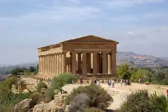 The Temple of Concordia (Italian: Tempio della Concordia, Greek: Ναός της Ομόνοιας) is an ancient Greek temple of Magna Graecia in the Valle dei Templi (Valley of the Temples) in Agrigento (Greek: Ακράγας, Akragas) on the south coast of Sicily, Italy. It is the largest and best-preserved Doric temple in Sicily[5] and one of the best-preserved Greek temples in general,[1] especially of the Doric order.[2][3] It is located a kilometer east to the Temple of Heracles.