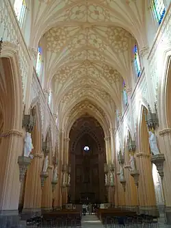 The main nave, compared to the two smaller ones, in addition to the sixth bay (which, compared to the previous ones, is shallower as it corresponds to the ancient apse of the thirteenth-century church) has another one, formerly used as a presbytery, whose floor is placed at a higher level than the hall and is connected to it by a series of steps. The room, covered with a cross vault decorated with the coats of arms of the royal family, is lit not by two single-lancet windows, but by two rose windows, below which open, with three pointed arches, two women's galleries: the one on the left, with independent access from the outside, was used as a royal box, while the one on the right (destroyed by a bomb during World War II, on September 8, 1943, and later rebuilt without, however, restoring its decorations) as a chancel.[42]