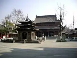 The Temple of the Qian Kings, also known by its Chinese name as the Qianwang or Qian Wang Temple, is a Chinese temple in Hangzhou, China, honoring the Qian family who ruled as kings of Wuyue in the 10th-century interregnum between the Tang and Song dynasties. Owing to the general lack of plural markers in Chinese, it is frequently understood as a temple specifically honoring Qian Liu, the first of the Wuyue kings, but it officially honors his entire dynasty.[1] The grounds include the tomb of Qian Liu as well as four of his children and are located beside the Park of Orioles Singing in the Willows.[1] The restored temple has been reckoned among the Ten New Scenes of West Lake under the name ”Loyalty Displayed at the Qian Temple“ (钱祠表忠, Qiáncí Biǎo Zhōng).[2]
