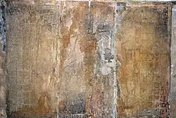 Inside the sanctuaries of the group of Crosses are found stone panels engraved with mythological scenes. The Tablet of the Sun represents the face of god GIII as a shield with two crossed lances over a jaguar throne carried by god L.[5]