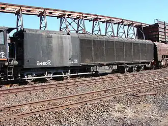 On British railways, brake tenders were low, heavy wagons used with early main line diesel locomotives. One or two were coupled in front or behind the locomotive to provide extra braking power when hauling unfitted or partially fitted freight trains (trains formed from wagons not fitted with automatic brakes).[15][16] They were required as the lighter weight of the new diesel locomotives, compared to steam, meant that they had comparable tractive effort (and thus train hauling capacity) but less braking ability.[17] Originally intended to be used in North East England, where they were usually propelled (pushed) by the locomotive, and later used in other regions. On the Southern Region they were normally hauled behind the locomotive.[15]