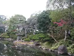 It served as the Osaka City State Guest House. A Japanese garden was also created at that time that included the tsuru no ike (Crane Pond). Emperor Meiji stayed here.[2] Emperor Hirohito stayed there in Shōwa 7 (1932). The Kishū Palace was renamed Tenrinkaku in Shōwa 8 (1933).[1][2]