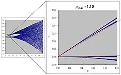 - A closer look at the orbit diagram shows that there are 4 separated regions at μ ≈ 1. For further magnification, 2 reference lines (red) are drawn from the tip to suitable x at certain μ (e.g., 1.10) as shown.