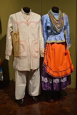 Today most men wear jeans, shirt and cowboy hat and sandals. Traditional clothing, worn by some men and more women, is very simple in the case of the first and very colorful in the latter. The male attire consists of a shirt, pants and blankets. Blankets in Northern Tepehuán are called kutum and sawira, respectively. In most communities, these items have a simple decoration in a colorful thread used to sew the hems and folds. Even in places like San Francisco de Ocotán, it is customary to tack pants, various multicolor tissues headbands, from the hem to the knee. The traditional hat, known as bonam, is made of soyate fabric with a circular shape. There are some variations in different communities. Like traditional dress, very few people these days use the leather and three holes Susak huaraches, although in some communities use is mandatory in ceremonies as mitote. The women's dress consists of three main parts: a skirt or springcity, a blouse with long sleeves and an apron around the waist. The fabrics are satin-like and decorated with lace and colored ribbons. The long socks use of bright colors is very widespread, roasted like plastic shoes. The outfit is enriched with long hair combs, beaded necklaces and earrings or other accessories. Men and women use traditional bags to complement their outfit.