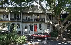 In Sydney it was particularly common for terraces in residential areas to have a corner shop built at the end of a row, often with a cantilever, wrap-around balcony overhanging the pavement.[132] A corner shop is situated at one end of Tuft's Terrace, Newtown (c. 1879), a row of eight built for Thomas Tuft, who himself owned and lived in a brick shop-residence on King Street.[133] All eight houses sport double-storey verandahs with Sydney-style openwork columns, separated by party walls. Early tenants of the corner-shop included grocers, fruiterers, and James Raymond, a butcher who occupied the premises from c. 1881-c. 1891.[131]