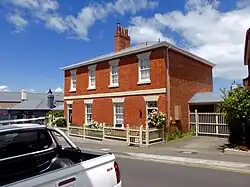 Despite the relatively small size of its major cities in comparison with those on mainland Australia, Tasmania, being one of the oldest European settlements, has a number of examples of early terrace housing, particularly in inner Hobart. These early proto-terraces were attached cottages that shared a common roof, often resembling a single dwelling.[126] Battery Point, Hobart contains many surviving examples of these humble attached cottages. One such example is Mr Watson's Cottages in Battery Point, a row of four attached red-brick cottages with trapeziod-shaped lintels and six-paned glass windows.[127] Many of these early examples have much in common with New South Wales examples from the same period. Albion House, Launceston (c. 1835) displays the same rare cast iron pattern on its unroofed balcony as Horbury Terrace, Macquarie Street (c. 1836).