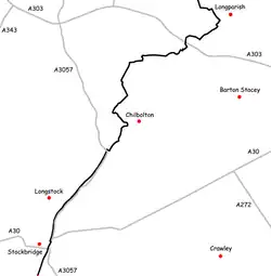 The northern end of the footpath starts in the car park on Walbury Hill. It passes through the towns of Romsey and Totton and the villages of Linkenholt, Ibthorpe, Hurstbourne Tarrant, St Mary Bourne, Longparish, Forton, Wherwell, Chilbolton, Stockbridge, Horsebridge and Mottisfont. The southern end of the footpath is at Eling Quay.