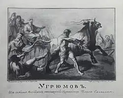 The figure of Usmar in Ugryumov's interpretation had a great influence on the students of the Academy of Arts. It is known about the existence of a drawing by Sylvester Shchedrin (early 19th century, State Russian Museum), which replicates the image of Usmar in minute detail. The image of one of the priests in Orest Kiprensky's drawing, entitled Pagan Priests Killing Christians in the Temple of Perun (circa 1803, State Tretyakov Gallery), also bears a striking resemblance to the figure of Usmar.[22] According to art historian Vladislav Zimenko, in this sketch by Kiprensky "the influence of Ugryumov is evident, for example, in the powerful athletic figure of the pagan on the far left, vividly reminiscent of Jan Usmar."[26] The sculptor Boris Orlovsky employed the central group of Ugryumov's painting, comprising Usmar and the bull, in his 1831 sculpture, entitled 'Jan Usmar'.[22] Furthermore, as part of an academic competition in 1849, a painting on the same theme was created by the artist Evgraf Sorokin. He was awarded a substantial gold medal and the privilege of an overseas pensioner excursion for this painting, entitled Jan Usmovets Holding the Bull (also known as Jan Usmovets Stopping an Angry Bull, canvas, oil, 207 × 266 cm, now in the Far Eastern Art Museum, inv. Zh-609).[27][28][29]