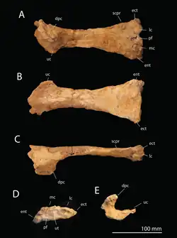 In 2021, Labita and Martill assigned a partial right wing (FSAC CP 251) from the same deposit to Tethydraco, but classified the genus as an azhdarchid possibly representing the wing-elements of Phosphatodraco based on its morphology, rather than a pteranodontid as originally proposed.[4] In 2022, the describers of Epapatelo noted that the humerus of Epapatelo shares similarity with that of Tethydraco and other non-Nyctosaurus pteranodontoids, and recovered Tethydraco as a pteranodontian closely related to Pteranodon.[5] In 2023, Pentland and Poropat noted that while the hatchet-shaped deltopectoral crest of FSAC CP 251 is consistent with Azhdarchidae, it differs from the shape of the Tethydraco holotype.[6]