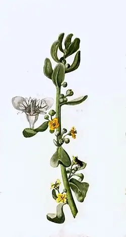 The fruits are unusual for Aizoaceae being four-winged, single-seeded and indehiscent. The wings are green and succulent at first, drying and becoming papery and brown, aiding in dispersal of the seed by wind.[2] The flowers are a rich source of pollen and nectar for honeybees.[3]