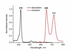 Tetraphenylporphyrin has a strong absorption band with maximum at 419 nm (so called Soret band) and four weak bands with maxima at 515, 550, 593 and 649 nm (so called Q-bands). It shows red fluorescence with maxima at 649 and 717 nm. The quantum yield is 11%.[11] Soret red shifts for Zn(TTP)-Donor systems relative to the Soret band at 416.2 nm for Zn(TTP) in cyclohexane have been measured.[9]