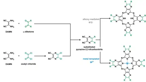 TPzs are usually synthesized upon the cyclotetramerization of pyrazine-2,3-dicarbonitriles, which itself can be synthesized either from the condensation of diaminomaleonitrile (DAMN) and substituted α-diketone derivatives or from the substitution of chloro pyrazine-2,3-dicarbonitriles.[15] To achieve TPz synthesis, pyrazine-2,3-dicarbonitriles can be reacted either through alkoxide-initiation using lithium butoxide or through templated cyclization pathways by adding a metal ion template.[8] Greatly electron-deficient macrocycle formation reactions, as is the case of TPz, require the use of templated method by utilizing a cyclotetramerization agent to avoid the risk of alkoxide initiator exchanging the positions of peripheral substituents.[8] Often, a mild cyclotetramerization agent is utilized to accompany the metal ion template, such as magnesium butoxide, to attain the MgTPz macrocycle.[8]