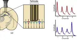 A tetrode is a type of electrode used in neuroscience for electrophysiological recordings. They are generally used to record the extracellular field potentials from nervous tissue, e.g. the brain. Tetrodes are constructed by bundling together four very small electrodes; each wire is generally less than 30 μm in diameter. Tetrodes are used to classify extra-cellular action potentials into sets generated by the individual neurons, as each channel of the tetrode is usually close enough to a cell such that action potentials emitted by that cell are detected on each of the four channels, but because of the spatial distribution of the individual channels, the amplitude of the signal varies across the four channels. Tetrodes can be built into an implantable device called micro-drive that moves them up and down with precision in the brain of experimental animals [1]
