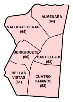 Featuring a total area of around 540 hectares (1,300 acres), the district is divided into 6 administrative neighborhoods (barrios): Almenara, Bellas Vistas, Berruguete, Castillejos, Cuatro Caminos and Valdeacederas.[1]
