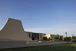 Museum of Texas Tech University with the Moody Planetarium in the foreground and the arroyo garden and main museum building extending westward.
