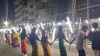 In earlier times, this dance was performed in the moonlight accompanied by folk songs. The music is rhythmic beating of drums accompanied by other instruments. It is performed in every locality on all the five days of the festival. As soon as the moon rises over the hills, the flute, drums and cymbals start. The boys and girls in a circle clutch each other's hands with rhythms of music slow and fast, high and low, up and down. If the number is great they may form two or three rows so that everybody and anybody can participate in the dance.