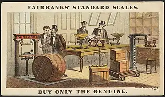 After experimenting with designs for a more accurate weighing method, Fairbanks devised a platform scale, which revolutionized the farming and business worlds by making it easy to weigh large containers.[13] By allowing a wagon or railroad car to be placed on the scale, to be weighed while full and empty, the Fairbanks scale enabled accurate weighing of products and payment to the sellers.[14] Fairbanks received a patent on the platform scale, which his brothers advised him to produce and sell.[15] In 1834, Fairbanks and his brothers Erastus and Joseph formed E. & T. Fairbanks Company to make and market the Fairbanks platform scale.[16]