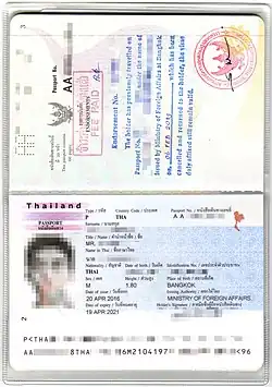![]() The front cover of a contemporary Thai biometric passport, 3rd version released 2020 | |