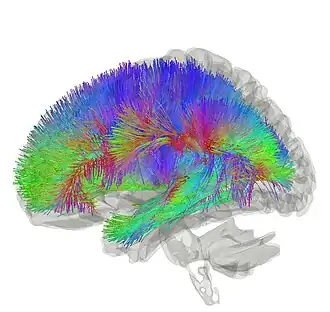 In neuroanatomy, thalamocortical radiations, also known as thalamocortical fibers, are the efferent fibers that project from the thalamus to distinct areas of the cerebral cortex.[1] They form fiber bundles that emerge from the lateral surface of the thalamus.[2]