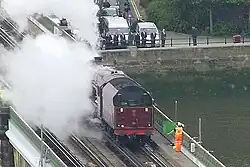 The procession of boats, which was 7.5 miles (12.1 km) long,[1] was formed up in sections, each led by a "Herald Music Barge" carrying ensembles playing music of different genres. The procession took approximately 90 minutes to pass any given point on the river,[9] while it was recorded as comprising 670 vessels of various types, both historic and modern.[1] Participating vessels came mainly from the UK with some Commonwealth, and a few non-Commonwealth participants. They ranged from rowing boats to sail and steam-powered vessels with historic vessels including many of the surviving Dunkirk little ships, a Māori waka (war canoe) which was present at the signing of the Treaty of Waitangi in 1840 and the tall ship Amazon which was present at Queen Victoria's Diamond Jubilee Royal Fleet Review.[9][16] Also taking part was the gig St Michael's Mount State Barge which was rowed rather than sailed down the river. Built around 1740, it is believed to be the oldest operational boat in the world and had ferried Queen Victoria in 1846.[17] The start of the pageant was signalled by a whistle from steam locomotive 6201 Princess Elizabeth on Battersea Railway Bridge. The Royal Family watched the beginning of the parade from the moored royal barge. Leading the pageant was a floating belfry fitted with eight bells, newly cast by Whitechapel Bell Foundry for the Church of St James Garlickhythe. Named after the eight senior members of the Royal Family and granted the title "The Royal Jubilee Bells", their sound was answered by churches along the route and around the UK.[1][18]
