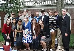 Like other secret societies at the university, The 21 Society routinely recognizes members of the community for their contributions to the university.[5] A speaker is generally invited to address the class in a reception. Twenty-one fourth-year students are recognized annually “for quietly serving this university, improving it in character and in name through persistent action.”[6] Speakers in the past have included Allen Groves, dean of students, Leonard Sandridge, former EVP/COO, and Marcia Pentz from the McIntire School of Commerce. Graduates of various schools of the university, such as the School of Law, have also been recognized in this annual ceremony. In addition to its ceremony for graduating students, the 21 Society has held recognition ceremonies for outstanding second-year undergraduate students and has sponsored events recognizing employees of the university. The society recognizes community members in other ways, including private letters.