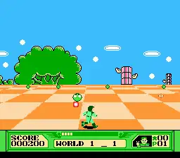The 3-D Battles of WorldRunner (shortened to 3-D WorldRunner on the North American box art),[3] originally released in Japan as Tobidase Daisakusen[a], is a 1987 third-person rail shooter platform video game developed and published by Square for the Family Computer Disk System. It was later ported to cartridge format and published by Acclaim for the Nintendo Entertainment System.[4]