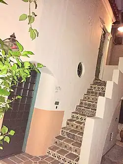 Architects Arthur and Nina Zwebell designed the structure around a richly landscaped interior courtyard.[3] Materials used reflected those commonly used in the Spanish Colonial Revival, Mediterranean Revival, Moorish Revival, and Mission Revival traditions: exposed wooden beams, cantilevered beams, carved wood, wrought iron, terracotta roof tiles, lightly textured buff-colored stucco, cast concrete, and brick.[4][5][6][7] Over the years, a cast of actors from the Golden Age of Hollywood lived at the Andalusia, including Sondra Locke, Clara Bow, Marlon Brando, Jean Hagen, John Payne, Teresa Wright, Louis L'Amour, Claire Bloom, and Cesar Romero.[2][8] Later, actor Jason Schwartzman occupied one of the units.[9] The building is located in a historic neighborhood south of Sunset Boulevard near the Chateau Marmont. The same block of Havenhurst Drive also includes two other apartment buildings listed on the National Register of Historic Places: the Colonial House (1416 Havenhurst Dr.) and the Ronda (1400–1414 Havenhurst Dr.).