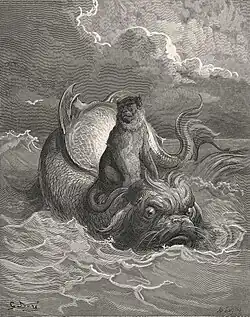The fable's appearance among La Fontaine's fables led to its being included in The labyrinth of Versailles during the 1670s. The 34th sculpture there is ascribed to Georges Sibrayque and once featured a dolphin from whose mouth a fountain jets while the gesturing ape rides on its back.[19] A later park sculpture of the fable, now in the Strasbourg Museum of Modern and Contemporary Art, was carved in polished sandstone by Jean-Désiré Ringel d'Illzach in 1903.[20] Various pictorial artists have also illustrated the fable, among whom were Gustave Doré[21] and Gustave Moreau.[22]