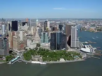 Aerial view of the Battery in 2010. At park's left is Pier A, at park's right is South Ferry Terminal. On the far right is the East River. | |