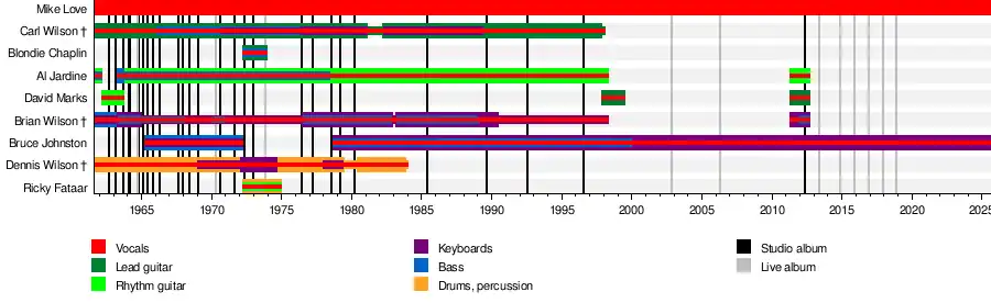 ![]() The Beach Boys' original lineup in 1967 From left: Carl Wilson, Al Jardine, Brian Wilson, Mike Love, and Dennis Wilson | |