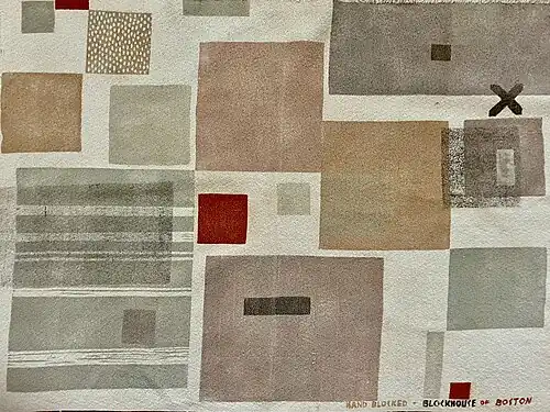 The Blockhouse of Boston was a pioneering art and design cooperative of alumni from the Massachusetts College of Art in Boston, Massachusetts that opened its doors in 1947.[1] Blockhouse artisans, primarily the then-recent art school graduate Janet Doub Erickson, designed and produced original textiles including draperies, wall hangings, table linens, costume treatments and other art. The co-op specialized in linoleum blockprints — also known as linocuts — and screen printing. Blockhouse was known for original use of New England themes and motifs intermingled with bold ethnic designs [2] at times inspired by pre-Columbian art and sometimes with modernist motifs.[3] As a journalist described some of Blockhouse principal designer Janet Doub Erickson's inspirations in a 1952 profile, "she goes to New Guinea for her motif, 'Checkerboard,' to China for her "Quan-Yin" design, to Guatemala for "Mayan Stele," and to a Northwest Indian reservation for "Totemotif."[4]