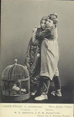 The Blue Bird (French: L'Oiseau bleu) is a 1908 play by Belgian playwright and poet Maurice Maeterlinck. It premiered on 30 September 1908 at Konstantin Stanislavski's Moscow Art Theatre, and was presented on Broadway in 1910. It was translated into English by Alexander Teixeira de Mattos. In 1911, Maeterlinck was awarded the Nobel Prize for Literature.