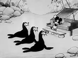 The Castaway was the first cartoon directed by Wilfred Jackson, who would go on to direct many Disney feature films, including Cinderella, Alice in Wonderland, Peter Pan and Lady and the Tramp. The circumstances were far from ideal: under pressure from distributors for another film and with little time to produce one, Disney tapped Jackson to produce a short made up of reused animation from other films.[1] The short uses recycled footage of a dancing gorilla (from 1929's Jungle Rhythm), a lion getting eaten by a crocodile (cut from Jungle Rhythm) and dancing seal lions (from 1929's Wild Waves).[2]