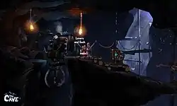 As the player controls the trio to explore the Cave, they collect objects and interact with the environment in a manner similar to an adventure game. The exploration of the game is based on 2D platformer elements, though the game is presented with 3D graphics. Exploration is described as being "Metroidvania"-like, where more of the Cave's tunnels and chambers become accessible as players collect objects in a manner similar to Metroid or Castlevania.[4][5] The player will need to work with all three characters, switching between them typically to activate multiple parts of a puzzle; one example shown in early press demonstrations was to use one character to ring a bell to distract a monster, a second character to repair a hot dog vending machine so to provide bait, and a third to operate a giant claw machine to pick up the monster to clear their path.[4] Each character has a unique ability to aid in maneuvering the cave tunnels, leaving some areas inaccessible if the appropriate characters aren't chosen at the start;[5] for example, the adventurer is able to swing herself across gaps with a rope, while the time traveler can phase shift a short distance, passing through closed gates. In addition, some areas of the Cave are accessible only to one of the specific characters; such as the knight finding a castle or the scientist discovering a laboratory; these areas represent the deep desires and dark aspects of a character that lured him or her to the Cave in the first place.[4] While there are hazards that can kill a character, the character respawns shortly afterwards nearby, allowing the player to reattempt the move.[6] Throughout the game will be iconographs for each of the three characters, which the player will need to get near to activate; these provide one of several still art images that reveal the character's back-story.
