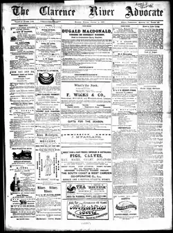 The Clarence River Advocate was first published in 1877 as the Lower Clarence Advocate. The first issue was published by W R Baker and James Madgwick on 28 December 1877. The paper was edited and published by Baker until 1889 from an office next to Maclean Post Office. John S Dunnet bought the paper in 1888, and later sold on the paper to David T Burt in 1896. The paper was later owned by Henry J Holt (1903 – 1908), Hedley Lobban (1908 – 1915) and E A Powell (1915 – 1949).[1]