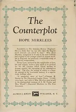 Hope Mirrlees dedicated The Counterplot to Jane Harrison, with a Greek epigram taken from Homer's Odyssey, which translates to "nothing is greater than when two people keep house together, man and wife, a great grief to enemies and joy to friends."[1] A list of books by the same publisher, appended at the end of the novel, includes a brief description of The Counterplot, calling it "a study of the literary temperament".[2]