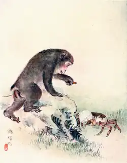 The Crab and the Monkey, also known as Monkey-Crab Battle (猿かに合戦, saru kani gassen) or The Quarrel of the Monkey and the Crab, is a Japanese folktale. In the story, a sly monkey kills a crab, and is later killed in revenge by the crab's offspring. Retributive justice is the main theme of the story.