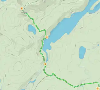 The trail starts off at relatively flat ground, connected with the La Cloche Silhouette Trail (46°02′39″N 81°19′27″W / 46.0441°N 81.3243°W). As the La Cloche Silhouette Trail diverges after only 1.5 kilometres, hikers are given an opportunity to proceed with the hike or take the La Cloche Silhouette Trail as usual. Continuing along, after 0.3 more kilometres, hikers will be able to see their first glimpse of the mountains from the Kakakise Wood Bridge which goes across the Kakakise Lake.[2] Hikers will continue on the lakeshore which has many areas usable for swimming for the next 0.8 kilometres.[1]