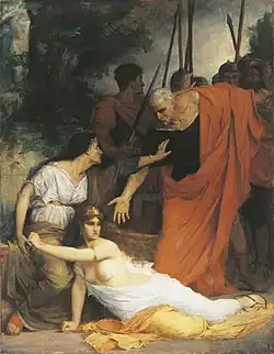 The death of Claudius's wife Messalina in the Gardens of Lucullus (as reported by Tacitus) was the subject set for candidates for the Prix de Rome in 1870. The historian relates that her killing was a hurried affair, ordered by the Emperor's freedman Narcissus when Claudius showed himself inclined to mercy. "Evodus, [another] of the freedmen, was appointed to watch and complete the affair. Hurrying on before with all speed to the gardens, he found Messalina stretched upon the ground, while by her side sat Lepida, her mother, who, though estranged from her daughter in prosperity, was now melted to pity by her inevitable doom, and urged her not to wait for the executioner."[2]