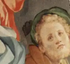 In addition to works of the same subject by other artists, Pontormo's own work from the time provides a useful comparison. The decoration in the dome of the Capponi chapel is now lost, but four roundels with the Evangelists still adorn the pendentives, which were painted by both Pontormo and his apprentice Bronzino. The swathed drapery in The Visitation (1529)[3] in the church of San Michele e Francesco at Carmignano bears a striking resemblance to that in the Deposition. The contrapposto of the figures can be compared to Pontormo's Annunciation (1520s) frescoed on the adjacent wall.