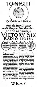 The Dodge Victory Hour, one of radio's first variety shows, debuted on NBC in January 1928. The premiere was produced at a cost of $67,600 (about $923,000 in 2013).