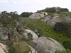 Production was initially planned to start in early 2014, but due to Winslet's pregnancy it was delayed to late 2014.[41][42] Pre-production finally began in September 2014, with the construction of fictional town Dungatar started on 16 September 2014[43] at Mount Rothwell, one hour out of Melbourne.[44][45][46] According to Maslin, after looking at many small towns around regional Victoria with Ham and Moorhouse, they decided to set the location of Dungatar "in the wheat-growing area of Victoria's Wimmera-Mallee".[47][48] Maslin added, "Rosalie is definite about it being in a wheatbelt but on a hill. We drove around Victoria, NSW and into South Australia for three years looking but never found all the elements. Then one day the location department at Film Victoria rang up and suggested the back of the You Yangs near Geelong, where Heath Ledger had filmed Ned Kelly. It had a granite outcrop and a landscape of dead trees. Our DOP Don McAlpine took one look and said ‘We have to shoot here’."[49]