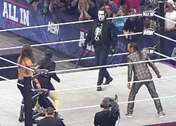 The following week, Danielson insulted The Elite and Page, labeling them "amateurs", leading to Page attacking the BCC, only to be beaten down and further attacked by Danielson who gouged Page's eye with a screwdriver.[80] The week after this, BCC (Jon Moxley and Claudio Castagnoli), brutally defeated The Elite's close associates, Brandon Cutler and Michael Nakazawa, leading to Omega and The Young Bucks to return fending off the BCC, with Omega almost impaling Moxley with a screwdriver.[81] On the April 19 edition of Dynamite, BCC attacked The Elite during an in-ring promo, leading to Callis bringing out his protege Konosuke Takeshita to save the group.[82] The following week, Omega and Takeshita defeated The Butcher and The Blade. Following the match, The BCC attacked Omega and The Young Bucks and attempted to recruit Takeshita to their group, although after begging the two factions to stop the brawling, BCC's Wheeler Yuta hit Takeshita with a low blow, before Takeshita was attacked by Danielson with a screwdriver once more.[83] A few days later, a Steel Cage match between Omega and Moxley was announced.[84] During the closing moments of the match on the May 10 episode of Dynamite, Omega pinned Moxley following a One-Winged Angel, only for Don Callis to betray Omega, by breaking up the pin, attacking Omega with a screwdriver, leading to Moxley pinning a knocked out Omega to win the match.[85] The following week, on the May 17 edition of Dynamite Callis attempted to explain his betrayal, but was interrupted by Omega. Shortly after, The BCC attacked Omega before entering the ring, warning Omega that they had won the "war" against The Elite. This led to The Young Bucks and a returning "Hangman" Adam Page coming to the aid of Omega, attacking the BCC. In the ring, Page claimed that he, Omega, and The Young Bucks, were The Elite, leading to him re-joining the stable after a near 3-year absence. Page also challenged the BCC to an Anarchy in the Arena match at Double or Nothing, which was soon after made official for the event.[86] At the event, The Elite lost after Konosuke Takeshita, who had aligned himself with The Elite in recent weeks, attacked Omega, turning heel and ending his brief association with the stable.[87] Page and the Young Bucks would then compete in a ten-man tag team match alongside Eddie Kingston and Tomohiro Ishii against Takeshita, the BCC and Shota Umino at Forbidden Door, which they won. Meanwhile, on the same card, Omega unsuccessfully defended the IWGP United States Heavyweight Championship against Will Ospreay. At Blood & Guts, The Elite, now including Kota Ibushi, defeated the BCC, Takeshita, and Pac in a Blood and Guts match.
