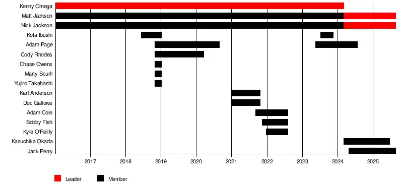 Cody Rhodes would eventually leave the group to focus on his own Nightmare Family stable; Page would also leave following a falling out with Omega and the Bucks. In December 2020, Don Callis, an executive vice president of Impact Wrestling, came to AEW as a guest of Omega and aided him in winning the AEW World Championship. Omega then began making appearances in Impact Wrestling alongside Callis, eventually winning the Impact World Championship, and reestablished ties with past Bullet Club teammates and Impact wrestlers Doc Gallows and Karl Anderson. Omega would claim to have "reformed the old Bullet Club", and once the group merged with the trio of remaining Elite members, Callis would take credit for "reforming" The Elite, which he called a "new Elite" and later dub "The Super Elite". Following the dissolution of AEW and Impact's partnership, Callis remained with The Elite while Luke Gallows and Karl Anderson quietly left, and were replaced in the group by Adam Cole, Bobby Fish, and Kyle O'Reilly, who all left in August 2022. Throughout this time, The Elite would collectively win the AEW World Tag Team Championship three times, once by Omega with Page and a record-setting two-times by The Young Bucks. The Elite would also become the inaugural AEW World Trios Champions in September 2022. Due to a common feud with the Blackpool Combat Club, Page rejoined the stable in May 2023. In July 2023, Kota Ibushi would re-join the group at Blood and Guts. In March 2024, Omega was fired and Page was suspended by the Bucks from the group, with Kazuchika Okada also joining the group at the same time. In April 2024, Jack Perry joined the group. In June 2025, Okada left the group to join the Don Callis Family.
