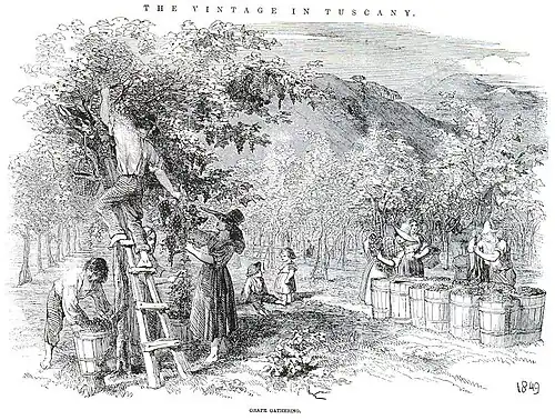 The 'marriage' of elm trees and vines continued in Italy from Roman times into the 20th century.[2] There are references to this both in works on husbandry and in poetry. The most famous of the latter was Ovid's account of the myth of Vertumnus and Pomona in his Metamorphoses. Vertumnus takes the shape of an old woman and urges the reluctant goddess to marriage by pointing to the vine in her orchard. In the version by the work's first English translator, Arthur Golding: